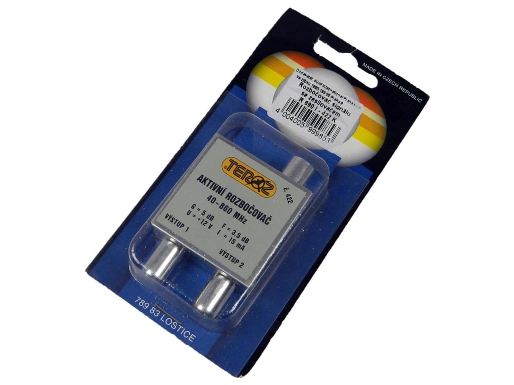 Aktivní anténní rozbočovač TEROZ s 2 výstupy č. 422Rozbočovač 1-2 aktivní určený pro rozdělení signálu do dvou zařízení. Podporuje frekvenční rozsah od 40 MHz do 860 MHz. Rozbočovač nabízí: