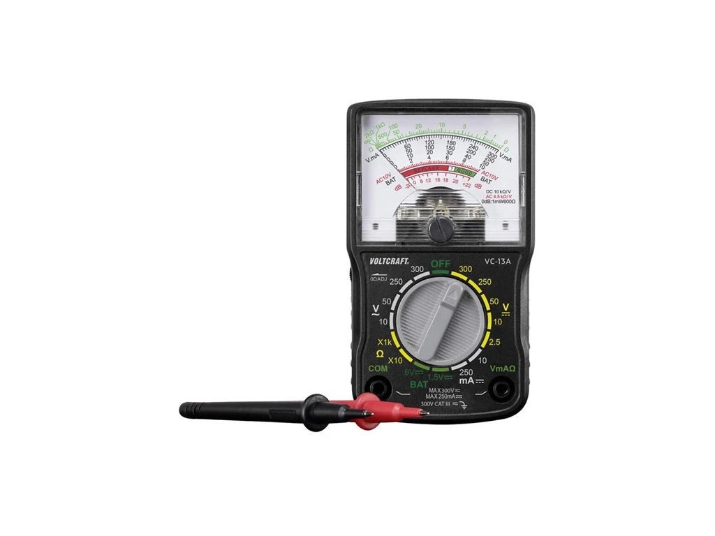 Analogový multimetr Voltcraft VC-13AKompaktní a odolný multimetr spojuje tradiční analogovou techniku měření s moderním vybavením. Měřicí vstupy jsou chráněny proti přetížení. Tento přístroj umožňuje měření AC a DC napětí, stejnosměrného proudu, odporu a testování baterií.