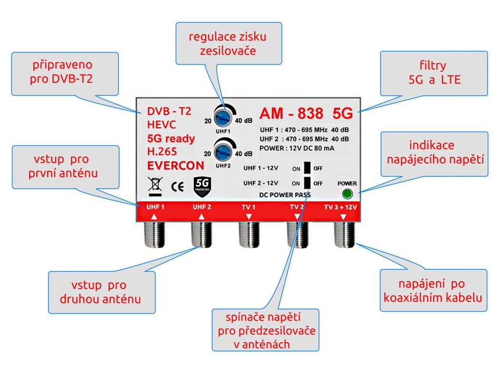 Zesilovač AM-838 5G je vhodný pro příjem signálů ze dvou různých směrů, což je ideální pro většinu území České republiky a Slovenska. Jeho vysoký zisk 40 dB zajišťuje stabilní příjem až pro 10 TV, což ocení uživatelé i v oblastech s nižšími signály. Zesilovač je navržen pro použití s pasivními směrovými anténami a není kompatibilní s aktivními anténami typu UFO, placka, SHARK apod.