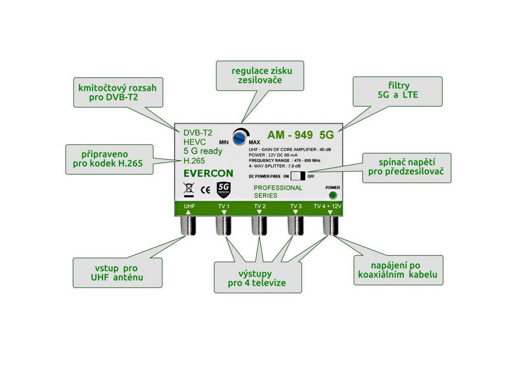 AM-949 5G je anténní zesilovač určený pro příjem pozemní TV v normě DVB-T2 H.265 HEVC. Je vybaven vestavěným filtrem pro LTE2 5G a je ideální pro oblasti s příjmem pouze z jednoho směru, neboť má pouze jeden UHF vstup. Tento zesilovač obsahuje rozbočovač, který umožňuje připojení až 4 televizorů nebo 4 větví TV rozvodu, s možností rozbočení na celkem 10 TV.