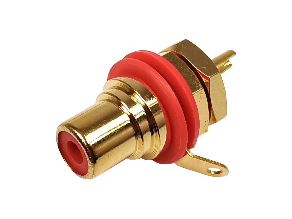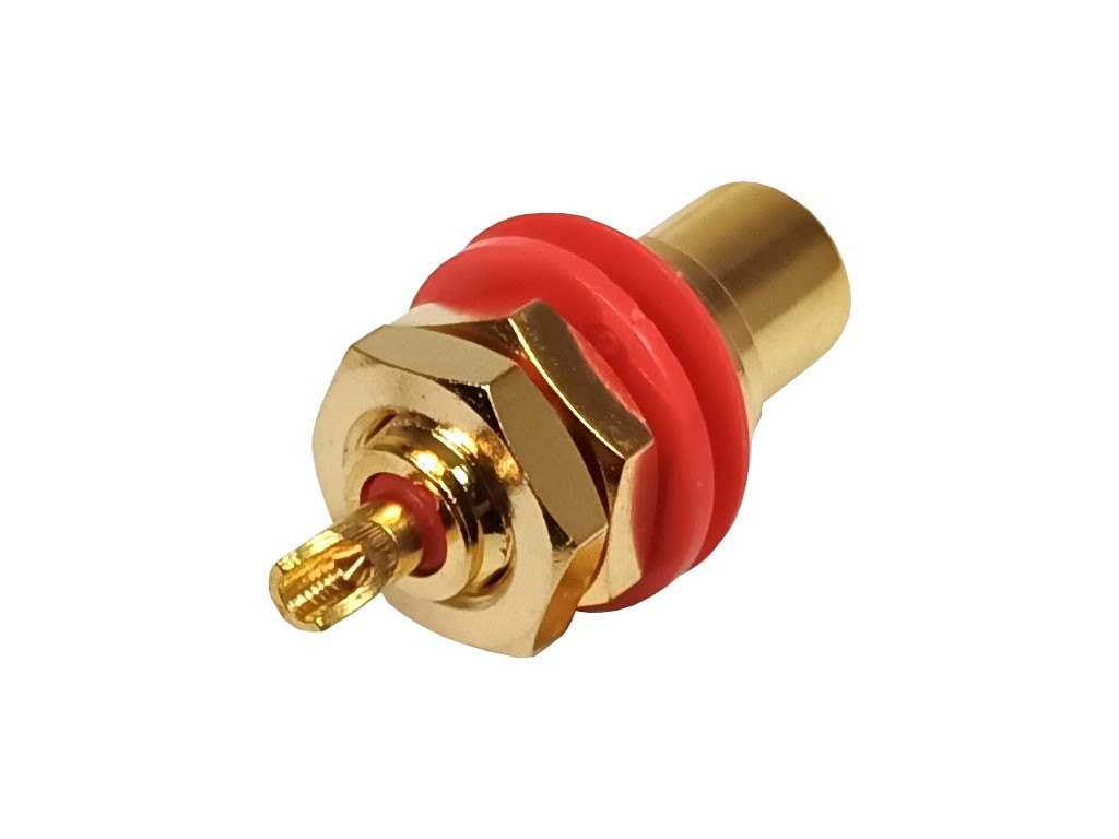 Izolovaná panelová zásuvka typu CINCH s pozlacenými kontakty a červeným označením. Tento konektor zajišťuje kvalitní připojení pro audio a video zařízení.