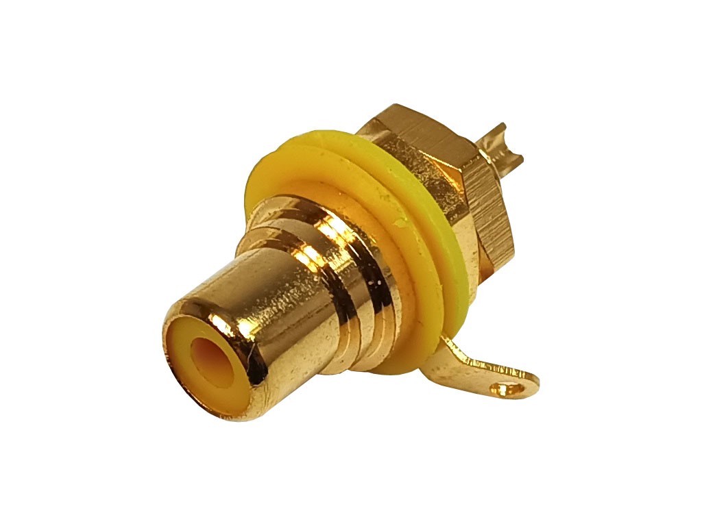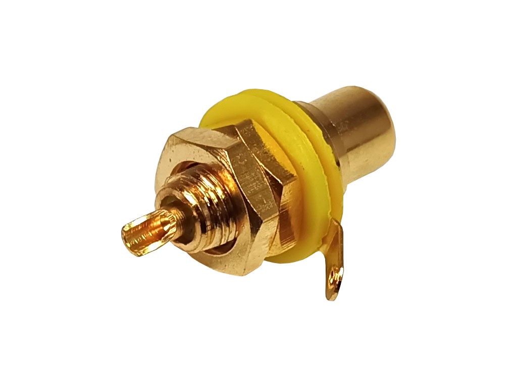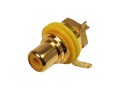 CINCH zásuvka s panelovým provedením, pozlacená pro lepší vodivost, s izolací a žlutým označením.
