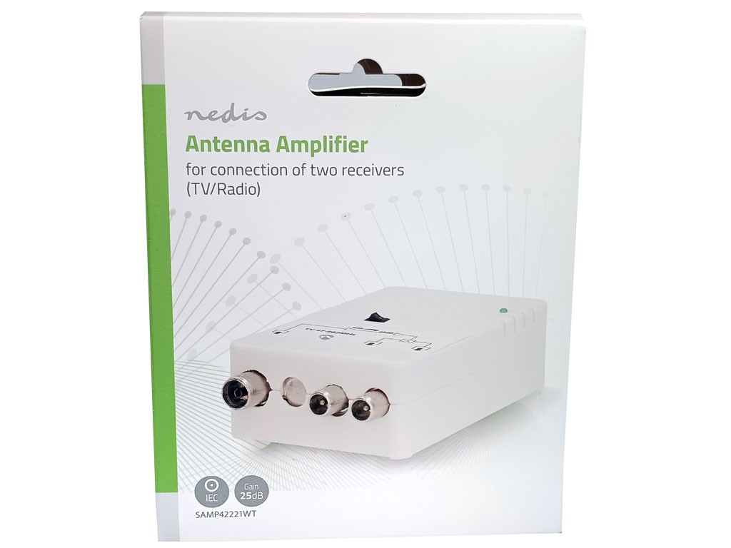 Domovní anténní zesilovač Nedis SAMP42221WT, 25dB, 2 výstupyFrekvenční rozsah: 40 ~ 862 MHz, Filtr: 5G, Konektory: IECpřímá náhrada za KÖNIG KN-AMP25 a SAMP40125WT