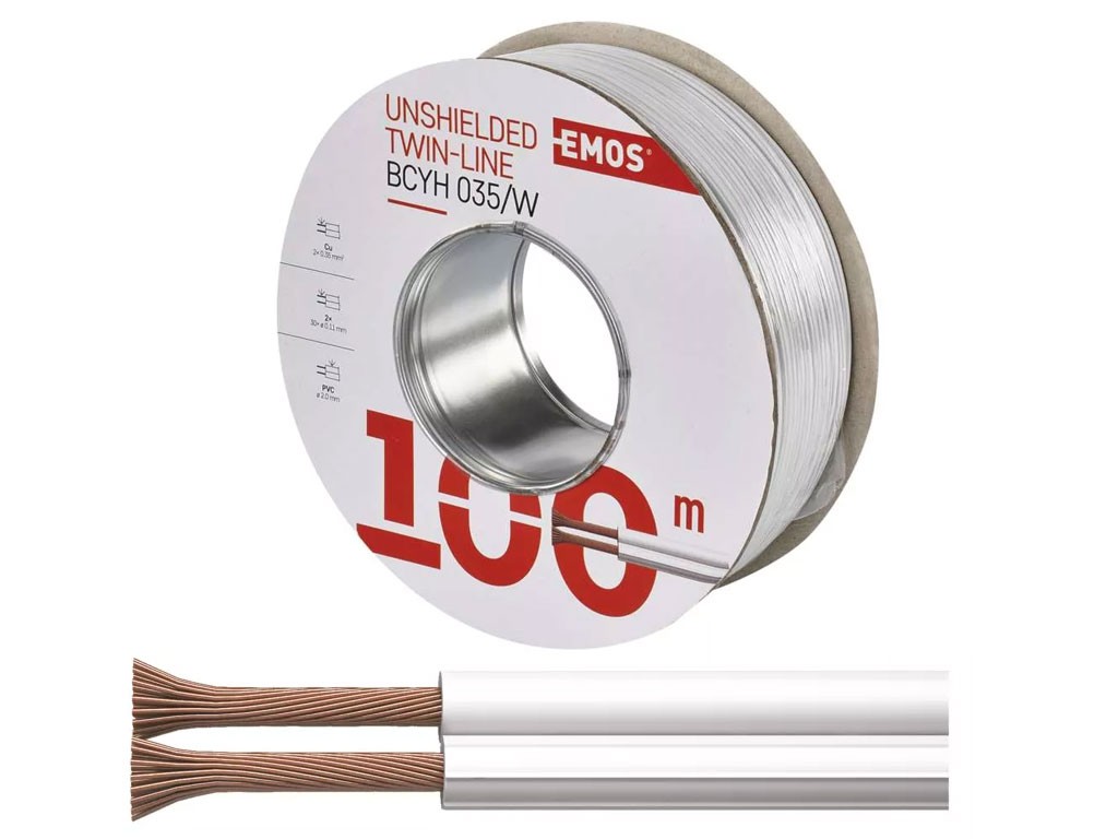 Dvojlinka 2x0,35mm BCYH035/W bílá - CU vodičeCu lanko vodičNestíněná dvojlinka s průřezem 2 × 0,35 mm², určená pro přenos nízkého napětí. Dvojlinka je vyrobena s bílým PVC pláštěm, který zajišťuje ochranu vodičů.