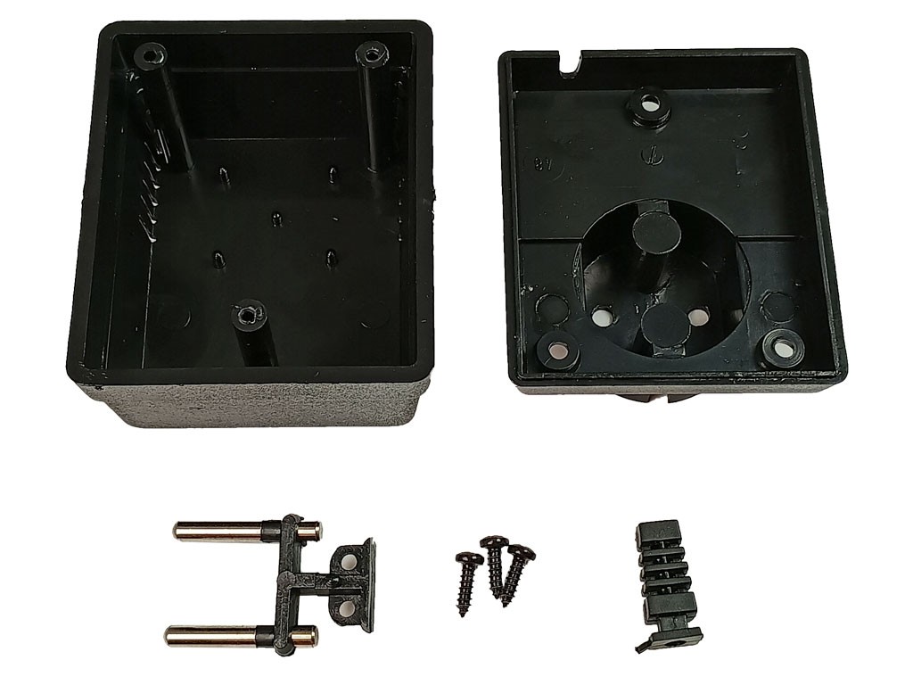 Jedná se o dvoudílnou větranou krabičku pro napájecí zdroj se síťovou vidlicí, která se spojuje třemi vruty.