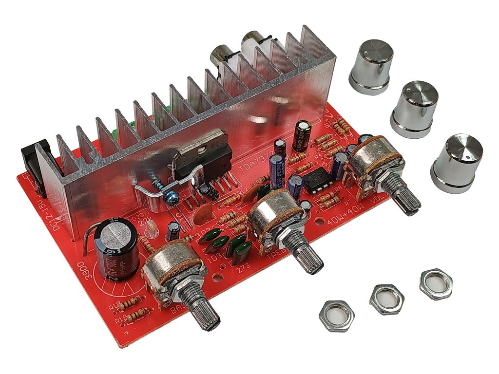Dvoukanálový Hi-Fi zesilovač 2 x 40W TDA7377Dvoukanálový stereo zesilovač s obvodem TDA7377 nabízí regulaci hlasitosti, výšek a basů. Je vhodný pro široké spektrum aplikací, včetně automobilového použití.