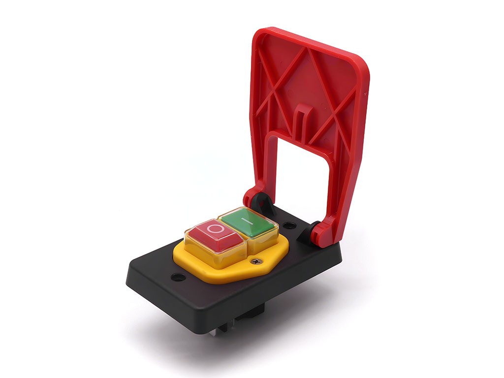 Přístrojový tlačítkový spínač s bezpečnostním tlačítkem a vodotěsným provedením, určený pro elektrické nářadí. Tento spínač je navržen pro 4-pinové připojení a je kompatibilní s různými typy strojů, avšak může vyžadovat úpravy pro některé aplikace.