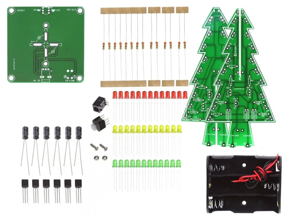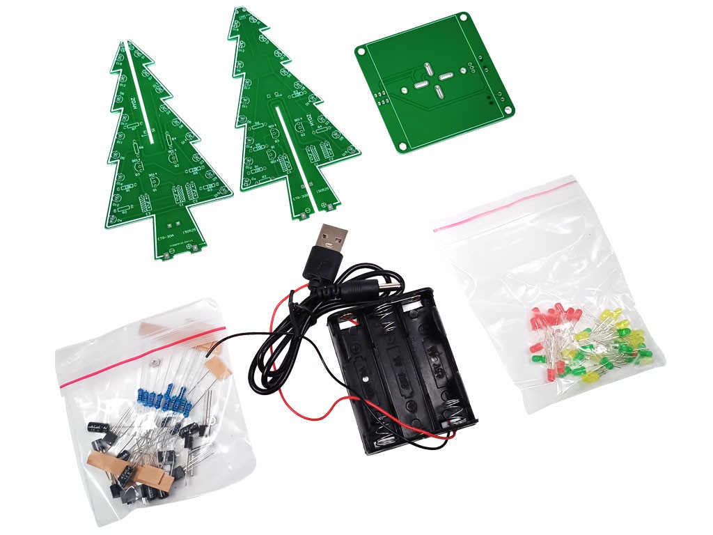 Elektronická stavebnice ve tvaru 3D vánočního stromečku nabízí jedinečné dekorační LED osvětlení. S 37 diodami v třech barvách vytváří efektní blikající světelnou show, což z něj činí ideální volbu pro originální vánoční dekorace, modelářské projekty nebo jako výukovou elektronickou stavebnici.