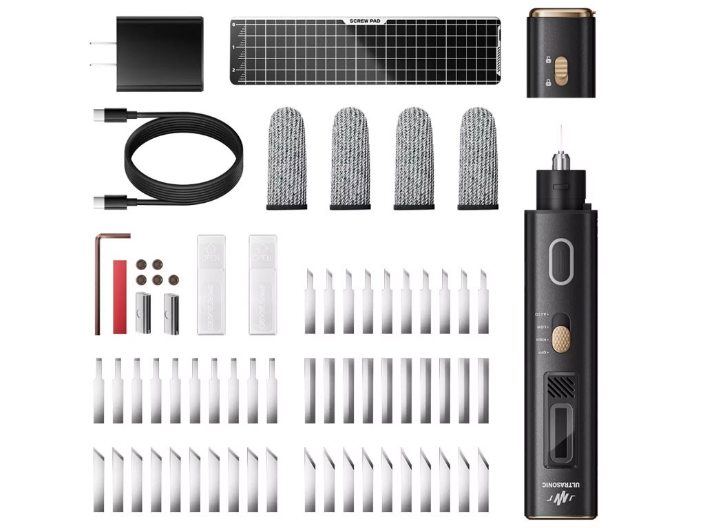 Díky soketu USB-C nebo adaptéru (u modelu s kabelem, bez baterie) je použitelný i jako mobilní nářadí. V balení najdete různé výměnné břity – například 30° tenké, 60° ostré nebo škrabkovací – vhodné pro široké spektrum úkonů v domácí dílně.