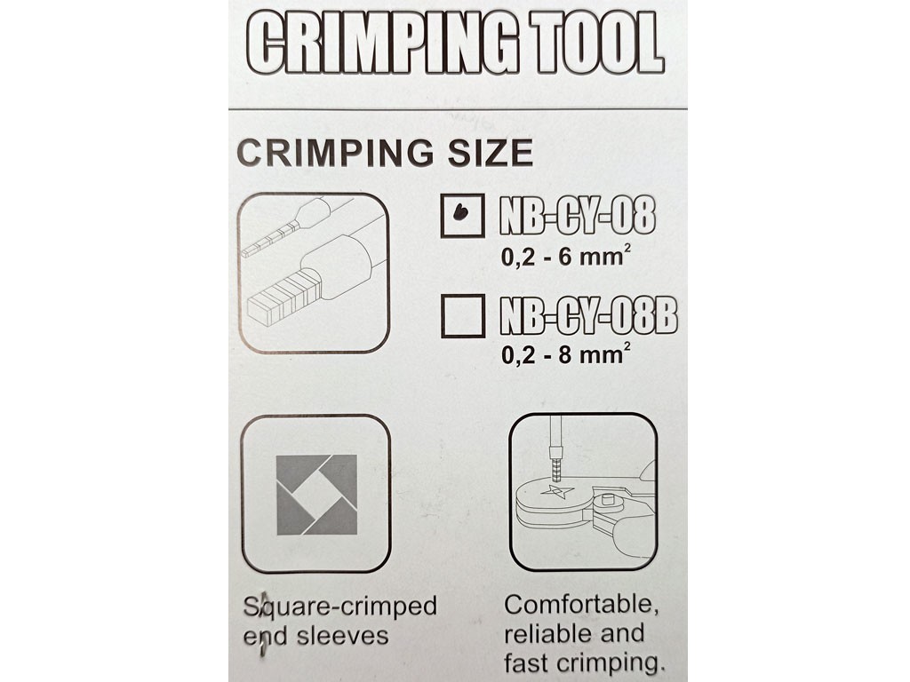 Kleště NY-CY-08 jsou určeny pro efektivní krimpování izolovaných trubičkových koncovek a dutinek. Tyto kleště zajišťují spolehlivé spojení kabelů s koncovkami v rozsahu 0,2 až 6 mm².