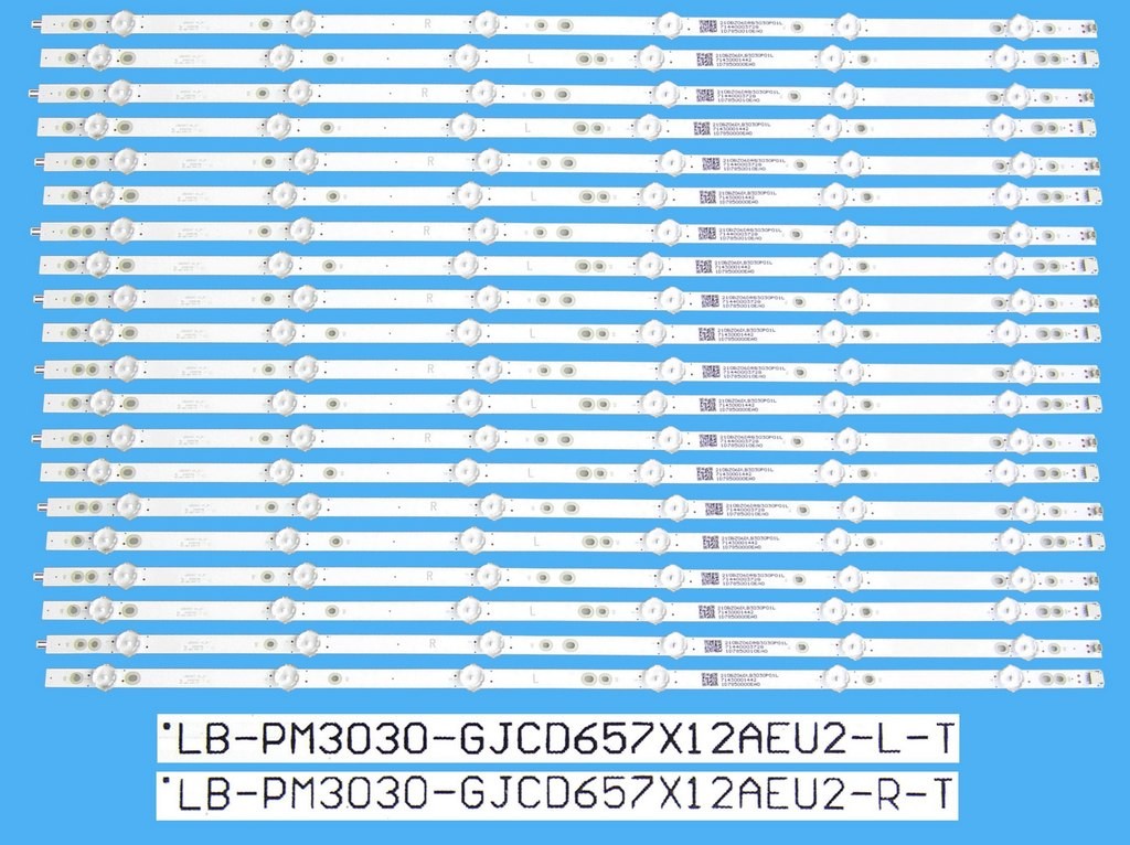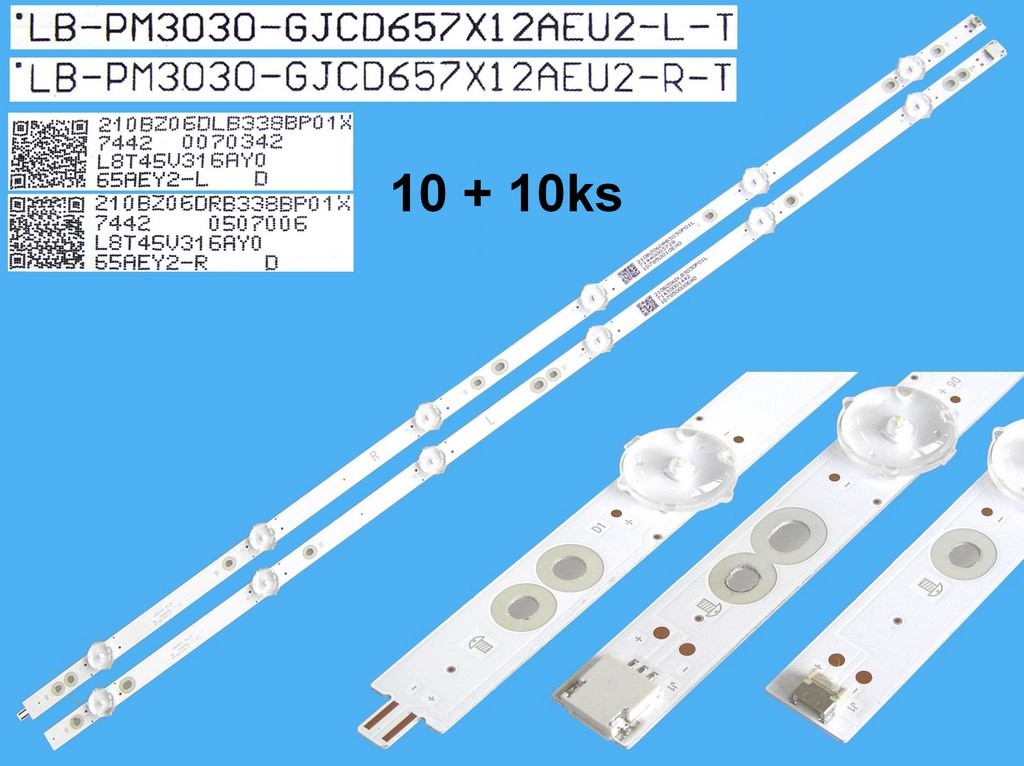 Popis:LED podsvit pro LCD TV, kompletní sada pro 65" panely TPV / Philips, originální náhradní díl Philips 996592000882 / 705TLB65B338BP01X. Sada obsahuje dva typy LED pásků po 10 kusech: LB-PM3030-GJCD657X12AEU2-L-T a LB-PM3030-GJCD657X12AEU2-R-T, nebo identické varianty LB-PM3030-GJCD657X12AEU2-L-Y a LB-PM3030-GJCD657X12AEU2-R-Y.