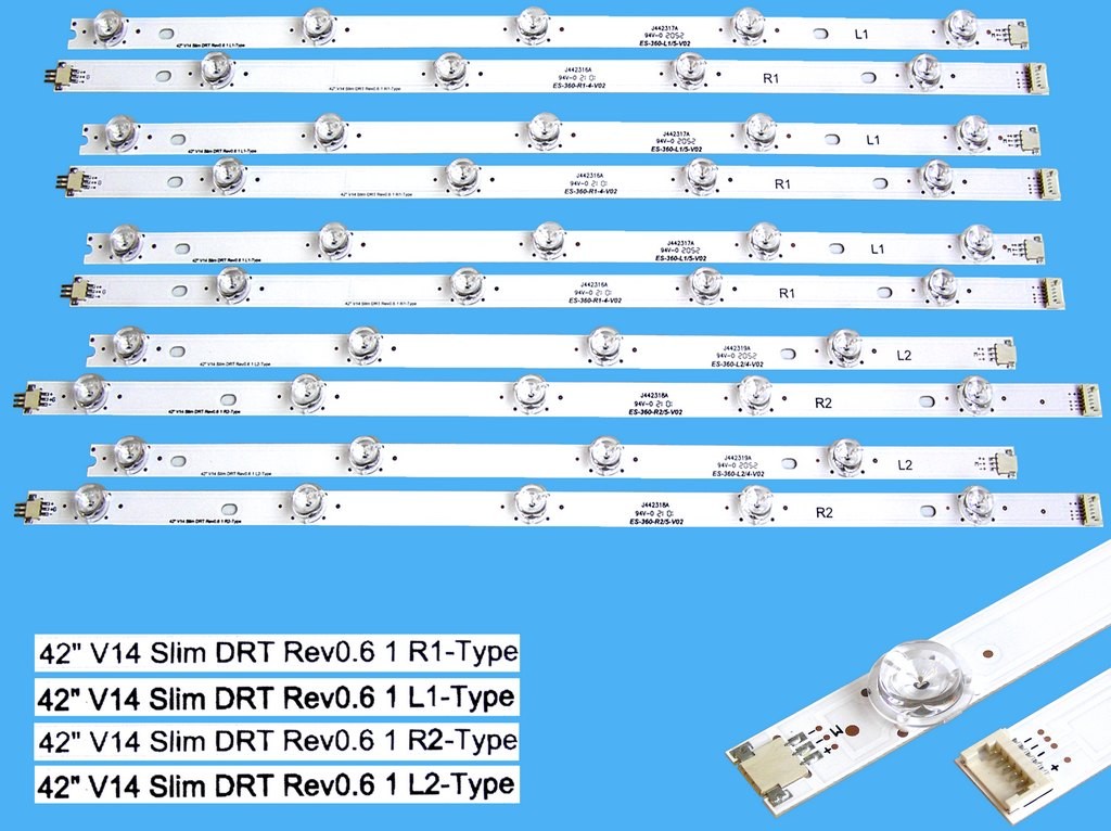 LED podsvit sada LG 42" V14 Slim DRT Rev0.6 - 10 pásků DLED TOTAL ARRAYLED podsvit pro LCD TV, kompletní sada všech podsvitů pro 42" panely LG, nejčastěji v provedení 3D. Sada je plně kompatibilní s neoriginálními výrobci.
