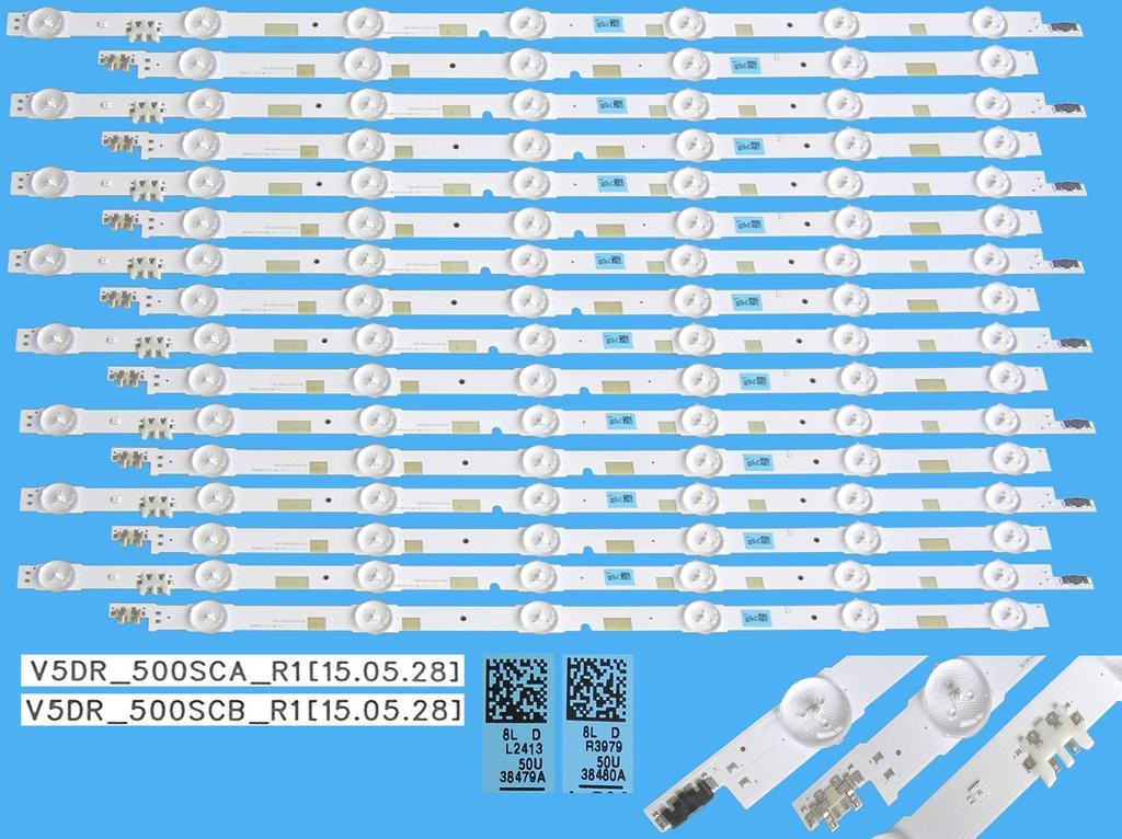 LED podsvit sada Samsung 16 pásků BN96-38479A + BN96-38480A pro 50" TVLED podsvit LCD panelu 50" SamsungLED podsvit pro LCD TV / LED backlight kompletní sada pro 50" panely. Tato sada obsahuje dva typy pásků, každý po 8 kusech: BN96-38479A a BN96-38480A. Jednotlivé typy mají rozdílnou délku a zasouvají se do sebe, čímž vytvářejí jednu kompletní linii. Délka pásku BN96-38479A je 563 mm, délka pásku BN96-38480A je 481 mm.