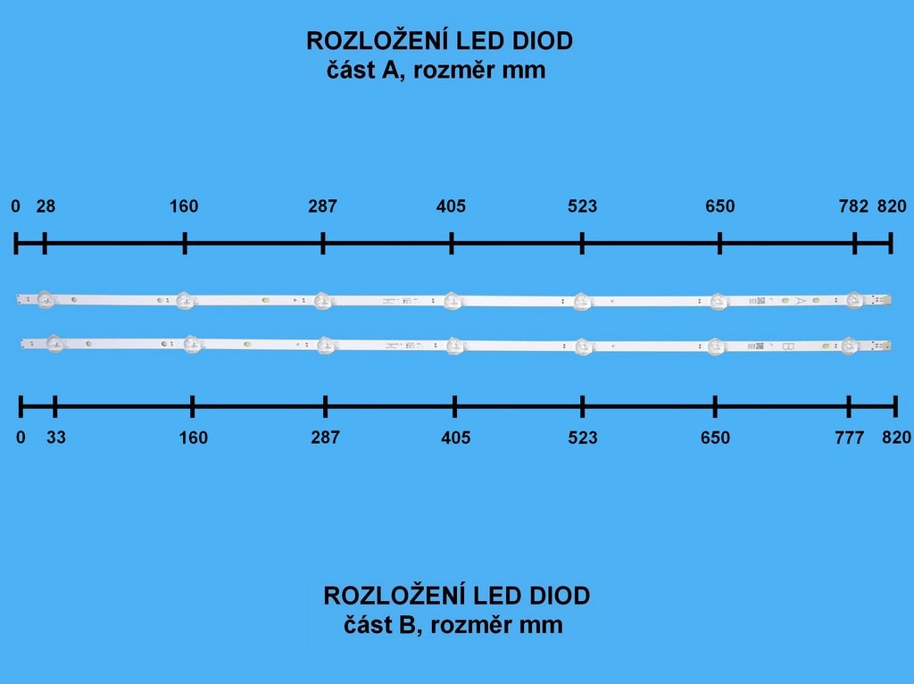 LED podsvit sada Vestel 17DLB43VER1 - 4 pásky 820mmLED podsvit pro LCD televizory s celkovou délkou 820 mm. Tato sada obsahuje 4 kusy LED pásků, které jsou rozděleny na část A a část B. Originální část A má typové číslo 30099541 a část B má typové číslo 30099543. Dodávka zahrnuje dva kusy části A a dva kusy části B.