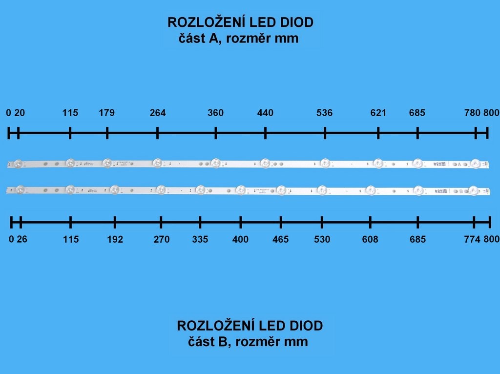 LED podsvit pro LCD TV s výkonem 360mA. Sada obsahuje 3 pásky, rozdělené na část A a část B. Dodávka zahrnuje 2 kusy části A a 1 kus části B. Pásky mohou být identické podle výrobcových možností a jsou určeny pro různé typy 43" panelů chasis Vestel.