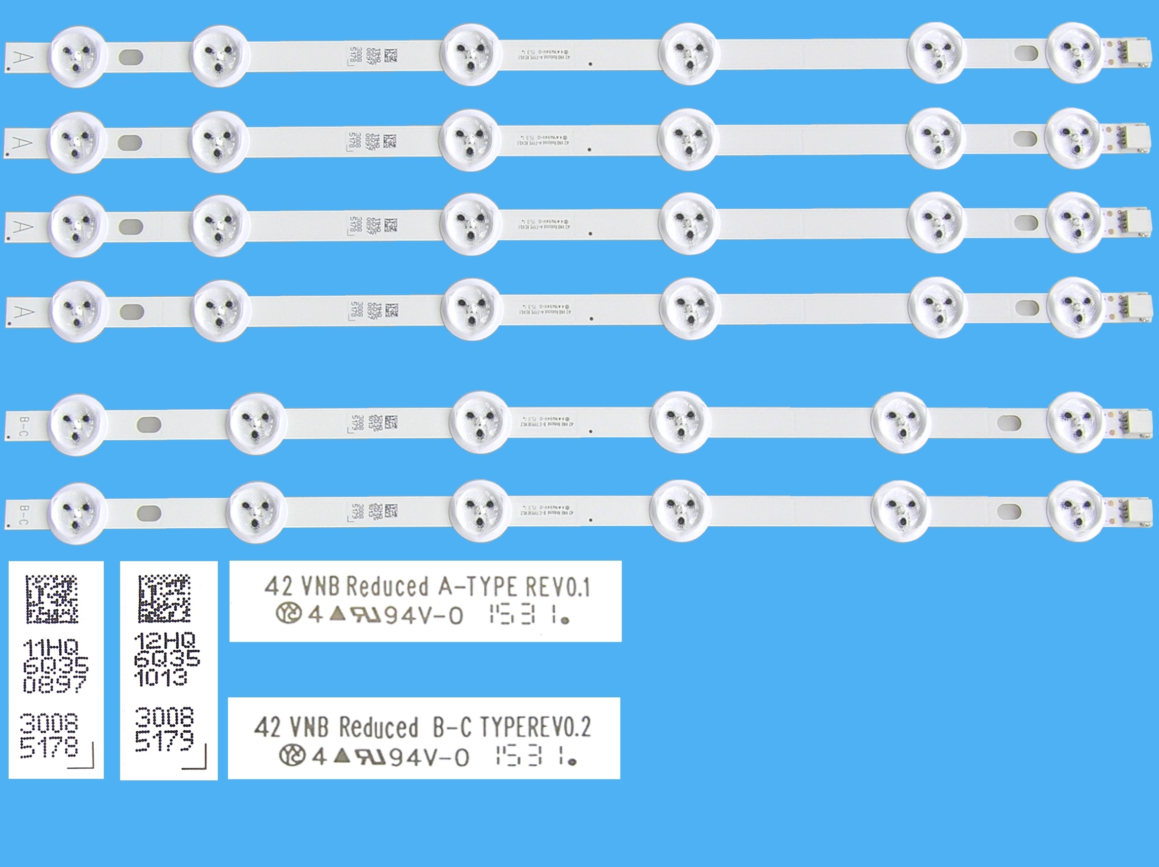 LED podsvit sada Vestel 23283028 - 6 pásků 373mm (4x type-A, 2x type-B)LED podsvit pro LCD panel 42" VestelLED podsvit pro LCD TV s hliníkovým jádrem zajišťující delší životnost. Tato sada obsahuje 6 LED pásků, které jsou rozděleny na část A a část B. Originální část A má typové číslo 30085178 a část B má typové číslo 30085179. Dodávka obsahuje 4 kusy části A a 2 kusy části B. Originální díly již nelze dodat.