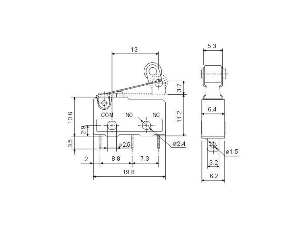 Mikrospínač KW11-3Z s kladkou, ON-(ON) 250V/5A, páčka 13mm. Celý popis