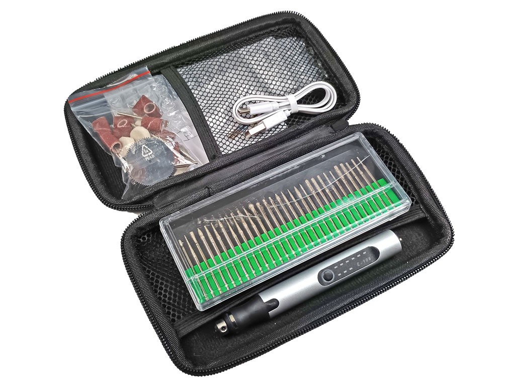 Akumulátorová mini bruska E108 s nabíjecím kabelem a příslušenstvímBezdrátová mini bruska E108 je ideálním nástrojem pro precizní práce v dílně. S napětím 4.2V a kapacitou 300mA poskytuje výkon 10W a nabízí tři stupně regulace otáček pro maximální kontrolu nad každým projektem.