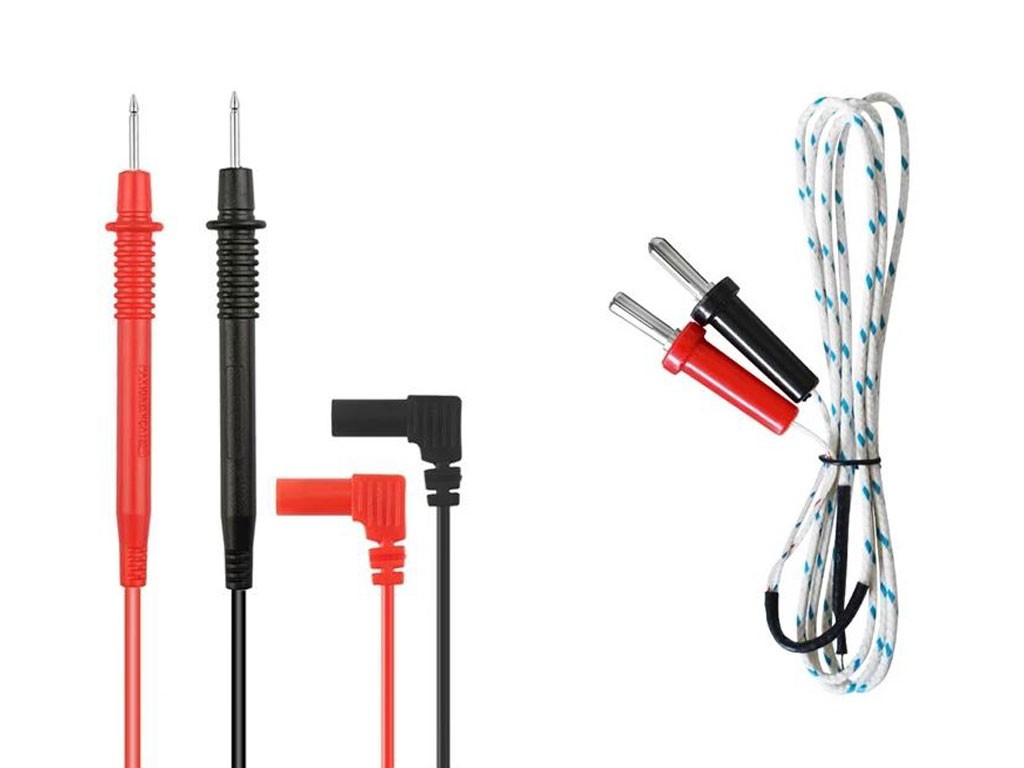 Multimetr (s baterií), gumové pouzdro, testovací kabel, návod