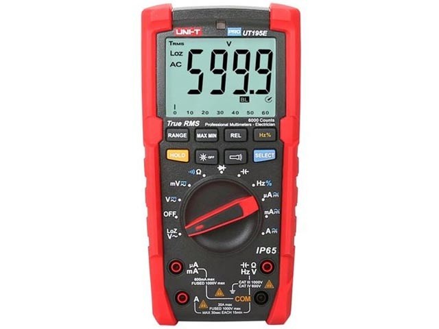 Multimetr UT195E je odolný přístroj určený pro elektrikáře, opraváře, údržbáře a servisní techniky. Je vhodný pro každodenní použití v drsných podmínkách. Přístroj vydrží pád ze 2 m a díky stupni krytí IP65 poskytuje vynikající ochranu proti vodě a prachu. S technologií TrueRMS můžete přesně měřit nesymetrické střídavé napětí a proud.