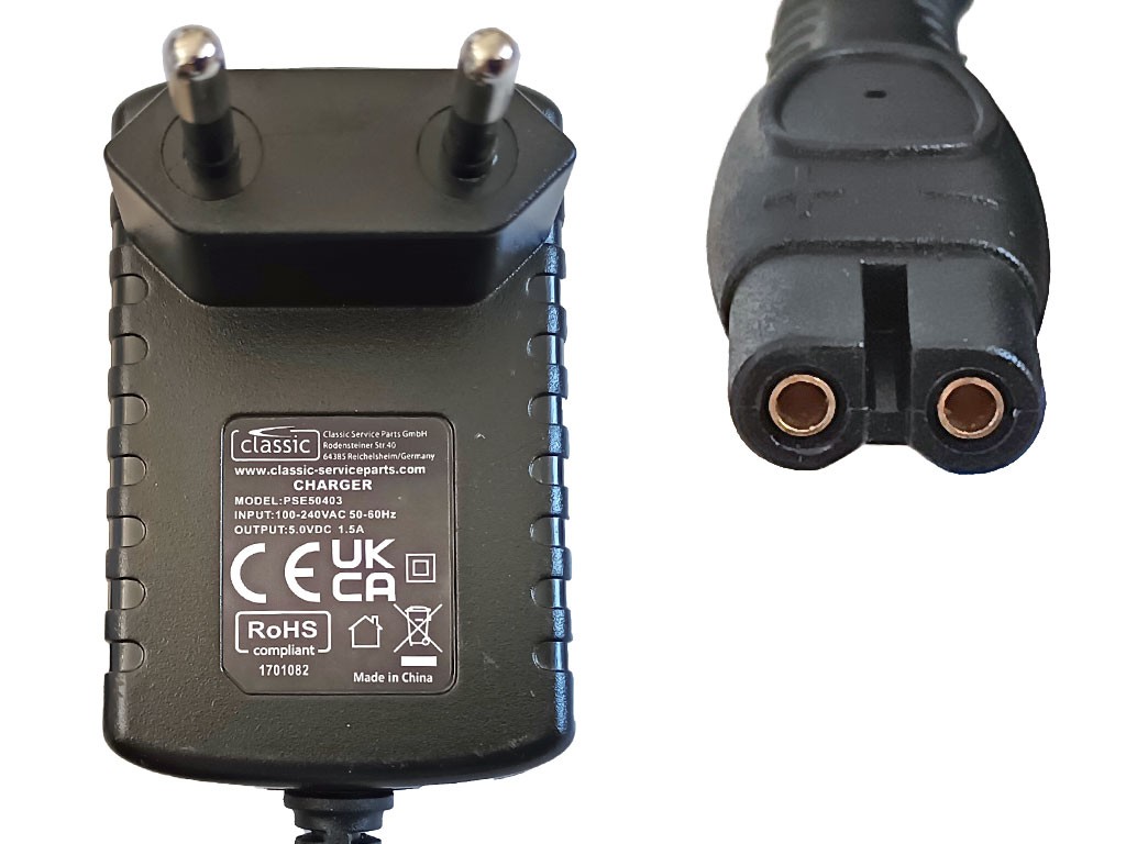 Nabíjecí adaptér PHILIPS 5V / 1.5A PSE50403 EUJedná se o alternativu originálního dílu PHILIPS. Adaptér nemá přívodní kabel a přímo se zapojuje do zásuvky (vstup EURO). Výstupní konektor je určen pro stejnosměrné holicí strojky PHILIPS.