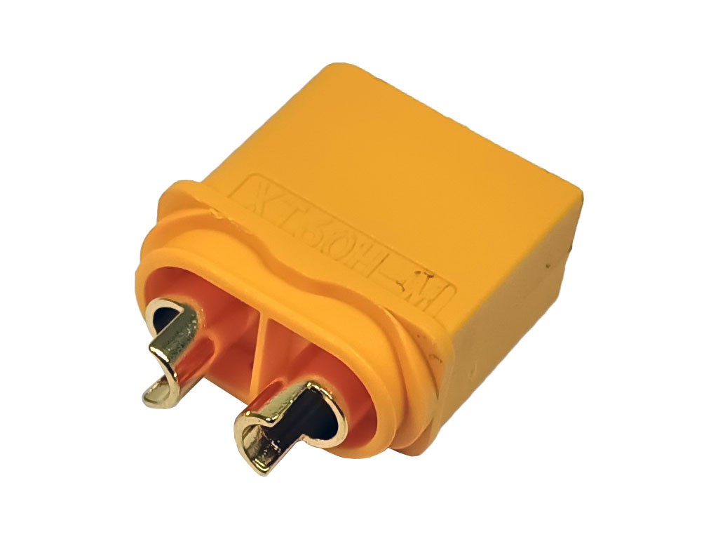 Silový konektor XT60, samec, je navržen pro maximální proud 60A, s trvalým zatížením až 30A. Je vybaven plastovými kryty kabelů pro zvýšenou bezpečnost a ochranu.