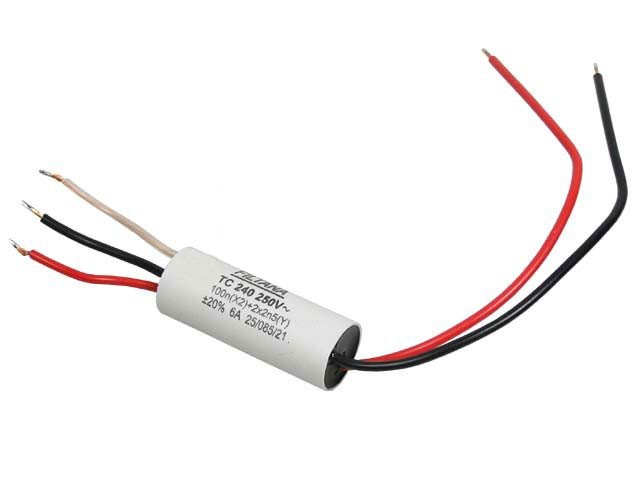 Odrušovací kondenzátor TC240 pro roboty Eta a sekačkyOdrušovací filtr pro roboty Eta 250V 0.1uF + 2 x 2500pF 6.3APětivodičové připojení, zapojení X2 - Y2, lankové vývody 40 + 140mm, vysoká kvalita. Maximální průchozí proud 6A.