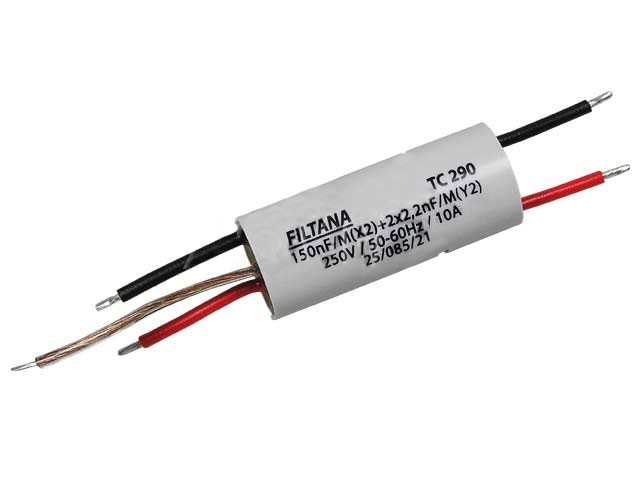 Odrušovací kondenzátor TC290 je určen pro komutátorové motory a impulzní zdroje. Tento průchodový odrušovací prvek disponuje pětivodičovým připojením s zapojením X2 - Y2 a lankovými vývody o délce 30 + 30 mm. Maximální průchozí proud činí 10 A, což zajišťuje velmi dobrou kvalitu a spolehlivost v provozu.