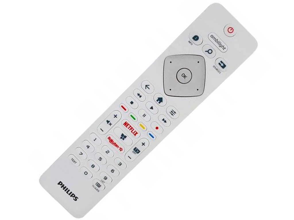 Tento dálkový ovladač je kompatibilní s televizory Philips a obsahuje tlačítka pro rychlý přístup na služby Netflix a Rakuten TV.