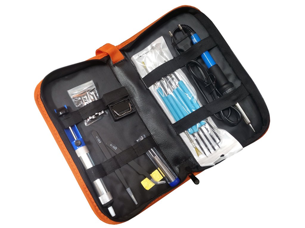 Pájecí sada s mikropájkou 60W a regulací teploty 230VTato pájecí sada je ideálním pomocníkem pro práci v garáži, servisu nebo dílně. Sada obsahuje mikropáječku s výkonem 60W a možností regulace teploty v rozmezí 200 °C – 300 °C, což zajišťuje vysokou flexibilitu při pájení.