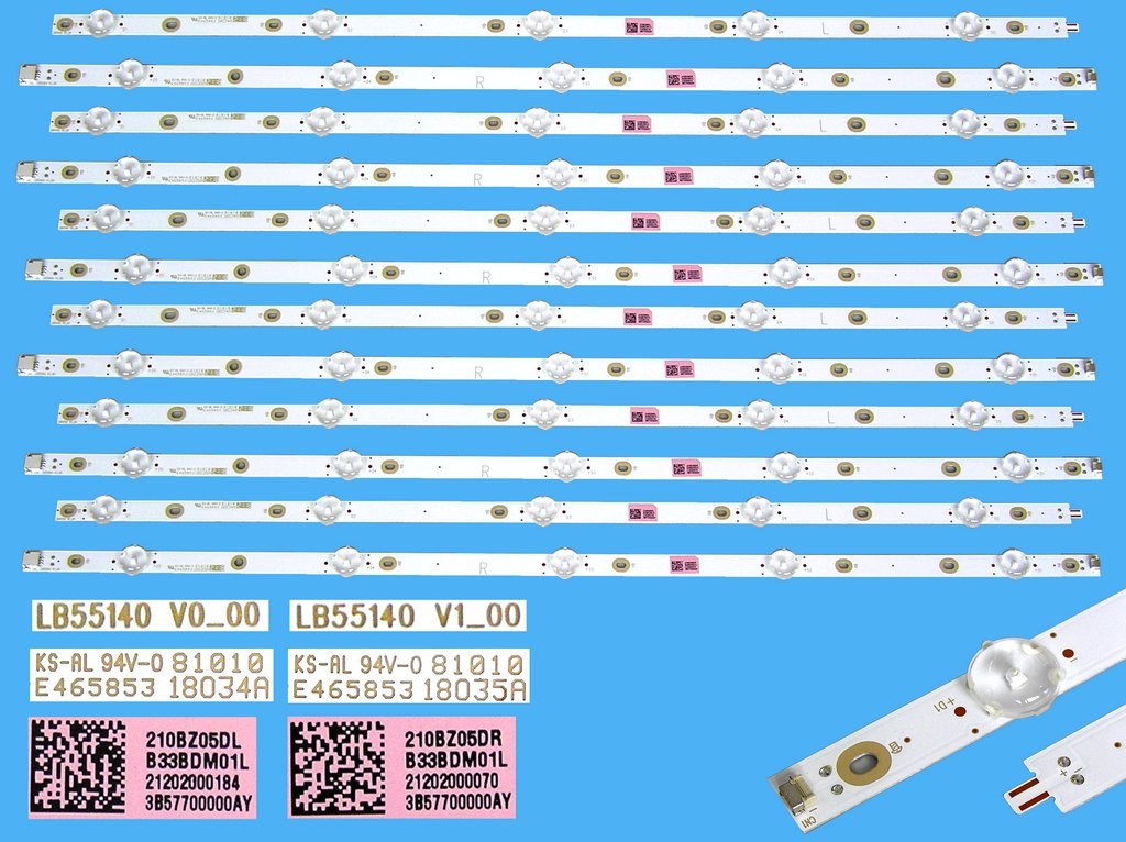 Philips 705TLB55B33BDM01L LED podsvit sada pro 55" LCD panelyKompletní sada LED podsvitu pro 55" LCD panely značky Philips. Sada obsahuje celkem 12 pásků s LED technologií, konkrétně 6 kusů typu LB55140 V0_00 a 6 kusů typu LB55140 V1_00. Každá část má rozdílnou délku a dva pásky se zasouvají do sebe, čímž vzniká jedna kompletní linie. Pásky jsou označeny jako L a R, přičemž délka dílu L je 545 mm a dílu R je 562 mm, což vytváří celkovou délku jedné linie 1100 mm.