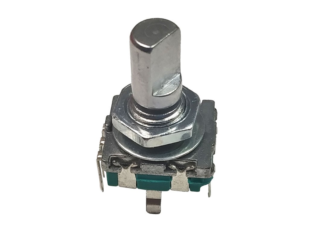 Potenciometr s multifunkčním přepínačem a tlačítkem, D hřídel 10mm:Tento rotační encoder generuje impulzy pro každý směr otáčení a neobsahuje odporovou dráhu. Disponuje funkcí tlačítka, přičemž kontakty jsou vyvedeny samostatně.
