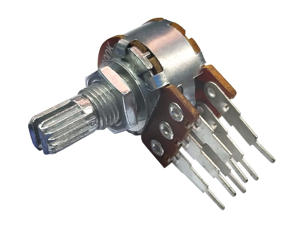Potenciometr stereo otočný 10kΩ lineární s drážkovanou hřídelí 6x9mm