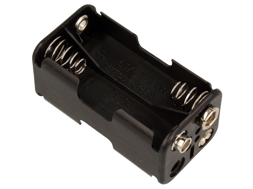 Praktické pouzdro pro čtyři baterie typu AA, uspořádané 2x2 vedle sebe. Tento držák je vyroben z kvalitního plastu v černé barvě, což zajišťuje jeho odolnost a dlouhou životnost.