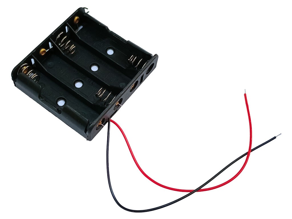Plastový držák na baterie určený pro čtyři tužkové baterie typu AA. Tento produkt je ideální pro projekty vyžadující externí napájení.