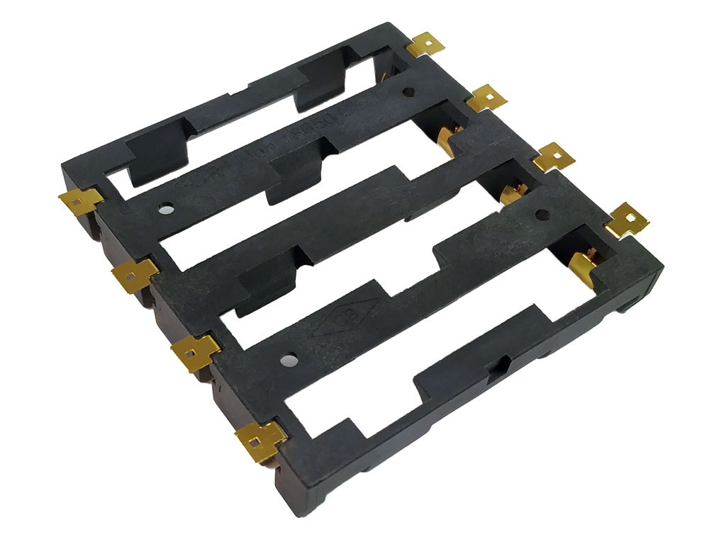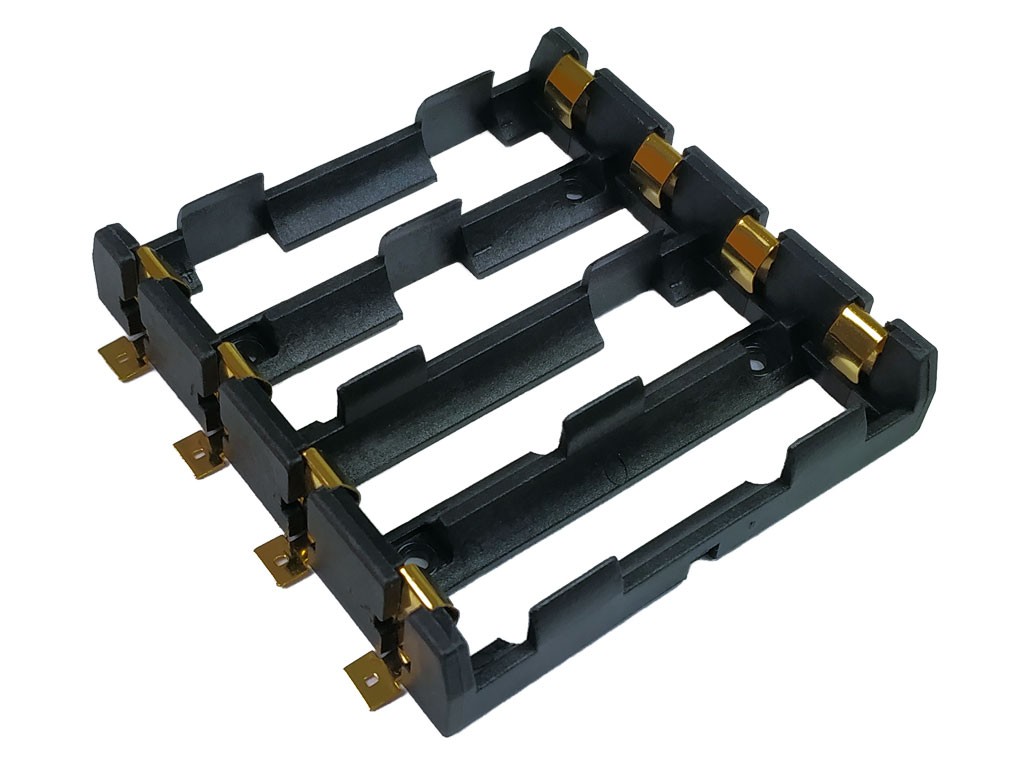 Plastový držák pro čtyři baterie typu 18650. Tento produkt je navržen pro snadné použití a spolehlivé připojení. Pozlacené vývody zajišťují vynikající elektrický kontakt a pájecí očka usnadňují instalaci.