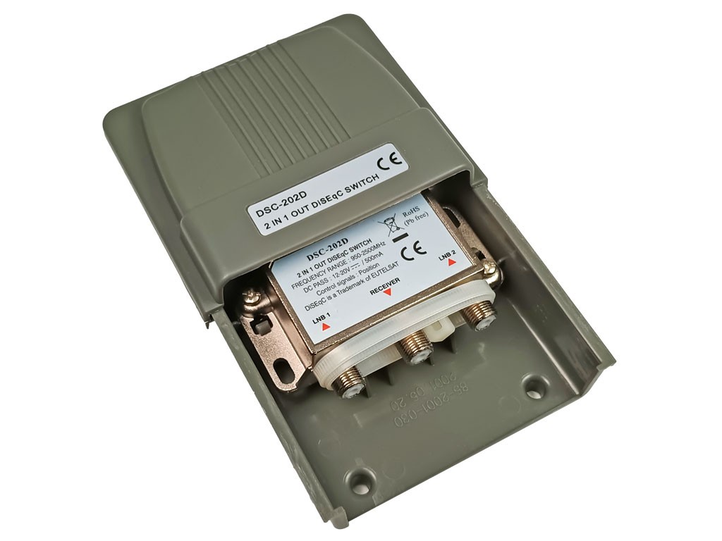 DiSEqC přepínač umožňuje příjem signálu ze 2 družic (2 konvertory) bez nutnosti natáčení. Tento model je vhodný pro všechny typy satelitních přijímačů a satelitních PC karet.