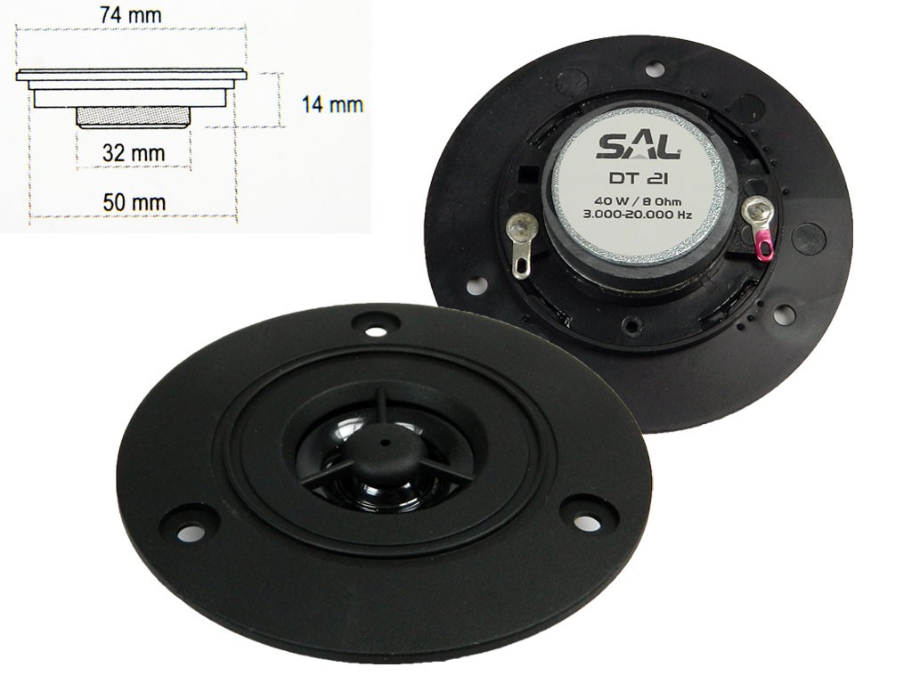 Reproduktor SAL DT21 8 Ohm 20 W - VýškovýReproduktor SAL DT21 je výškový reproduktor s průměrem 74 mm a impedancí 8 Ohm. Tento model je navržen pro optimální audio výkon a je ideální pro různé audio aplikace.