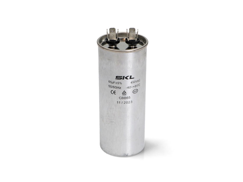 Rozběhový kondenzátor 65 µF (65,0 µF) 450V 50/60Hz CBB65 SKL, faston konektory 6.3 mm