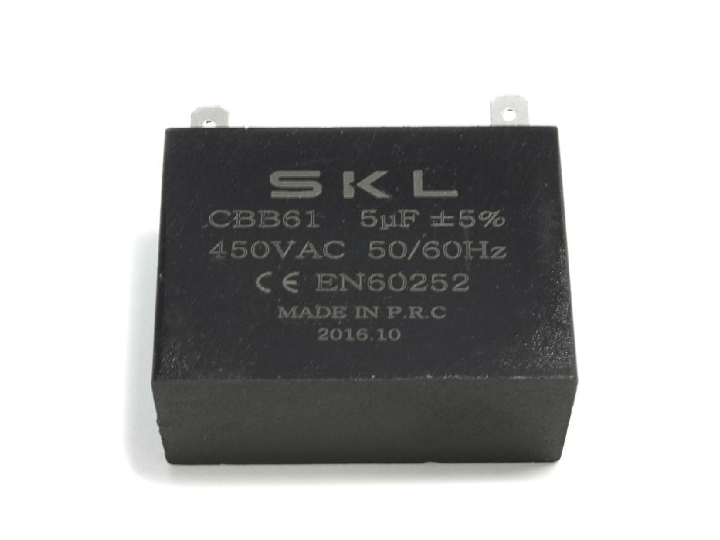 Motorový kondenzátor CBB61 s kapacitou 5 uF je určen jako rozběhový kondenzátor pro elektrické ventilátory. Tato elektronická pasivní součástka obsahuje svitek z pokovené polypropylenové fólie, který je uložen v plastovém pouzdře a zalitý polyuretanovou pryskyřicí. Pryskyřice chrání kondenzátor před vlhkostí a zároveň slouží jako antivibrační materiál.
