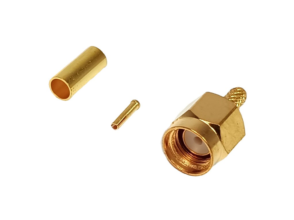 RP-SMA Konektor pro RG174 - Krimpovací Samec Reverzní - ZlacenýTento RP-SMA konektor je určen pro kabel RG174 a je navržen jako krimpovací samec s reverzním provedením. Konektor je zlacený, což zajišťuje lepší vodivost a odolnost proti korozi.