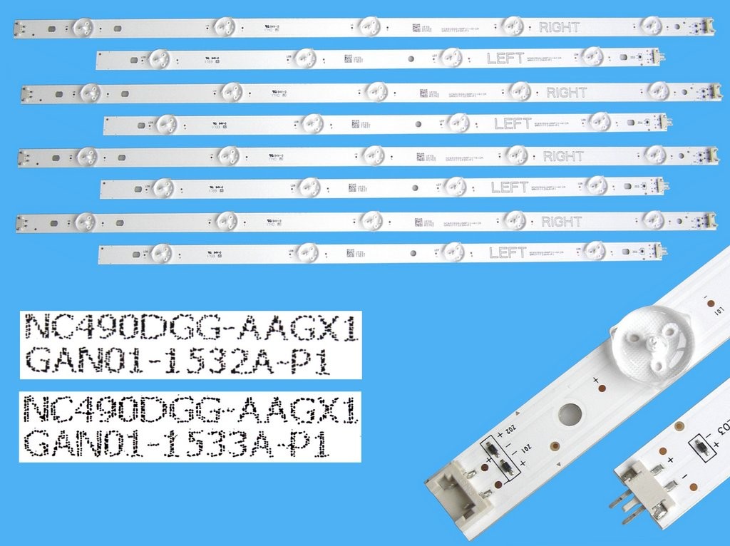 Kompletní sada LED podsvícení pro LCD televizory o velikosti 49-50". Obsahuje celkem 8 LED pásků, z toho 4 kusy typu LEFT GAN01-1532A-P1 a 4 kusy typu RIGHT GAN01-1533A-P1. Délka dílu L je 445 mm (včetně konektoru) a délka dílu R je 554 mm. Celková délka jedné linie je 994 mm. Sada je plně zaměnitelná za modely GAN01-1255A-P1 a GAN01-1256A-P1.