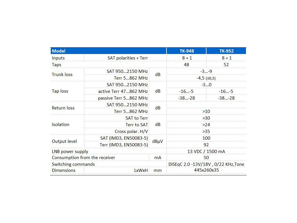 TeleTek multipřepínač 9/48 je kvalitní satelitní zařízení určené pro připojení dvou družic a až 48 účastníků. Tento unikátní přepínač zajišťuje vynikající kvalitu signálu i při nízkých úrovních díky patentovanému spínacímu tranzistoru, který efektivně reguluje nízkou úroveň signálu.