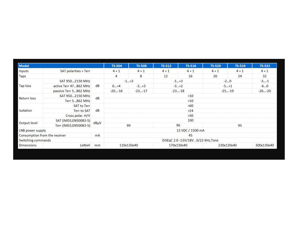 - Výstupy: 8x SAT + 1x TV