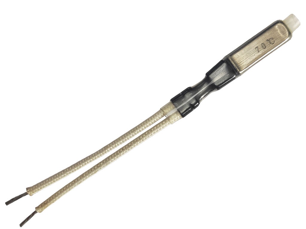 Kovový rozpínací termostat 70°C s parametry 2A/250V, ideální pro vinutí.