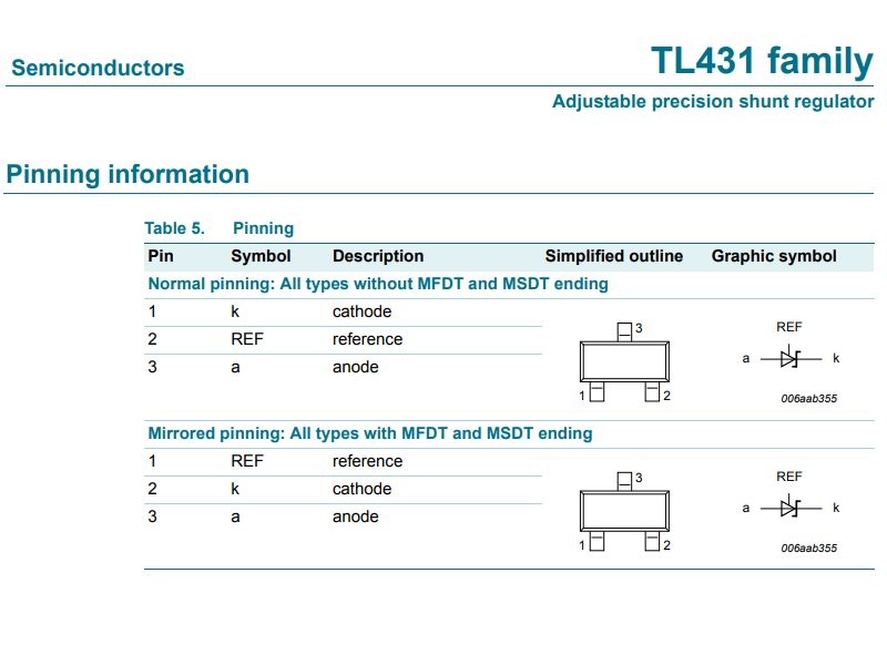 Obvod TL431 v SMD pouzdru se vyrábí ve dvou variantách, které se liší v připojení pinů. Anoda je vždy samostatný střední pin. Katoda a Reference jsou piny, které mohou být prohozeny, a tudíž je nezbytné správně identifikovat potřebný obvod, neboť na pouzdru není tato skutečnost nikterak vyznačena.