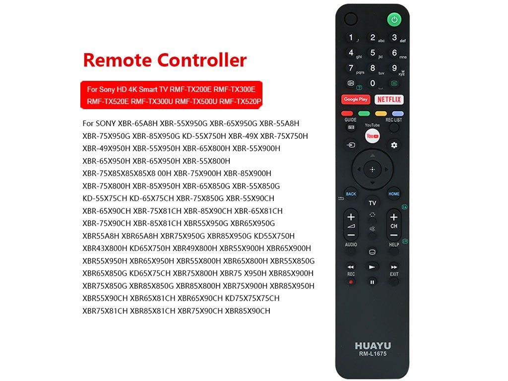 Dálkový ovladač HUAYU RM-L1690 je navržen pro snadné ovládání televizorů značky SONY. Tento model je kompatibilní s různými typy televizorů a nabízí přístup k populárním aplikacím jako Netflix a Prime Video.
