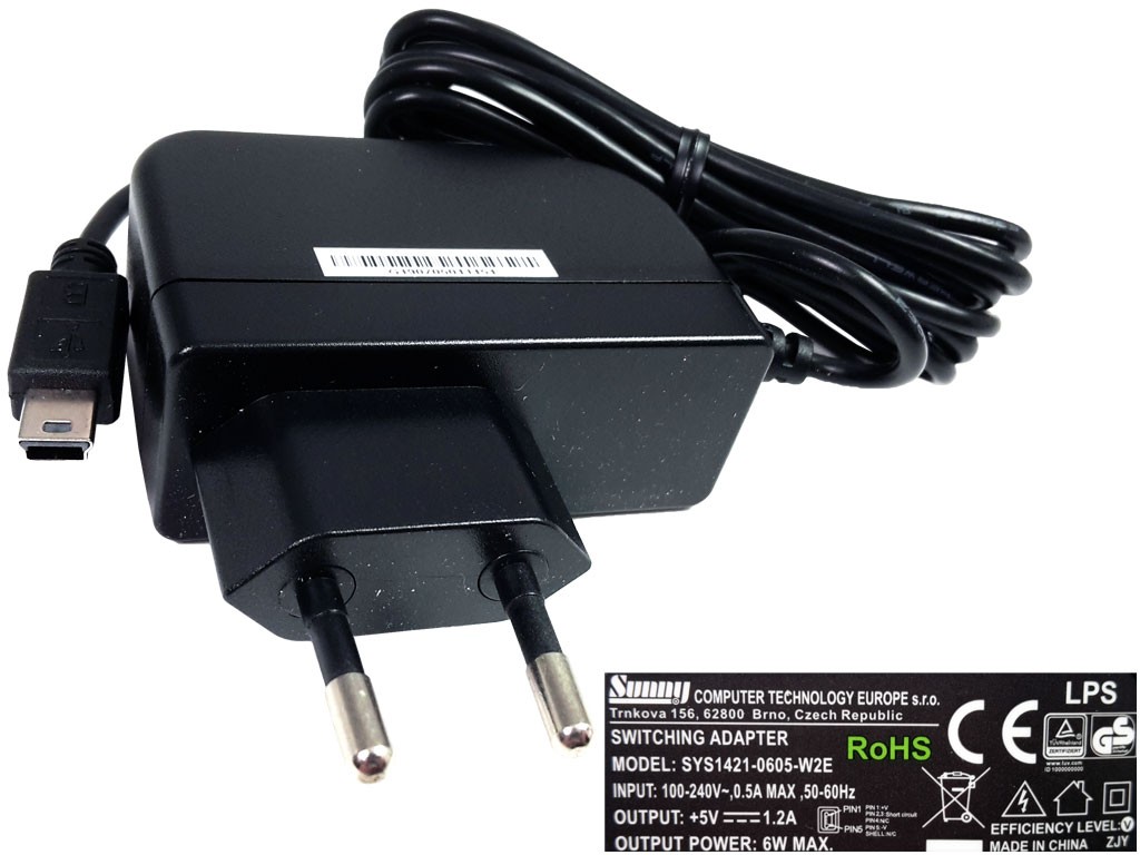 Univerzální napáječ 5V / 1.2A s mini USB, délka kabelu 1,5 m.
