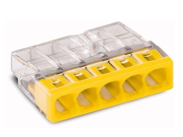 Bezšroubová krabicová svorka WAGO 2273-205 je určena pro spojení plných vodičů o průměru 0,5 - 2,5 mm² a je určena pro 5 vodičů. Tato svorka je vybavena transparentním pouzdrem a žlutým krytem, což usnadňuje vizuální kontrolu připojení.